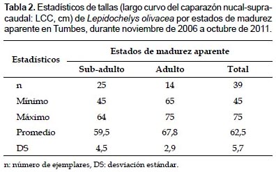Análisis de datos.-Se determinaron los parámetros biométricos de los ejemplares (mínimo, máximo, promedio y desviación estándar) y el porcentaje de los estados de madurez aparente (EMA: sub-adultos y adultos), considerando la talla promedio de hembras anidantes en la playa El Valle, Colombia (65 cm LCC; Barrientos y Ramírez 2008).