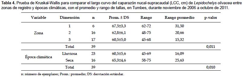 En la zona 1, el 83,3% de ejemplares se consideró adulto (68,6 ± 2,2 cm LCC; n= 5); mientras que en las zonas 2 y 3, el 62,5% (59,6 ± 4,8 cm LCC; n= 10) y 82,4% (59,4±4,6 cm LCC; n= 14) se consideraron sub-adultos. Según la prueba de Kruskal-Wallis, las tallas presentaron diferencias significativas entre zonas de registro (Tabla 4).
