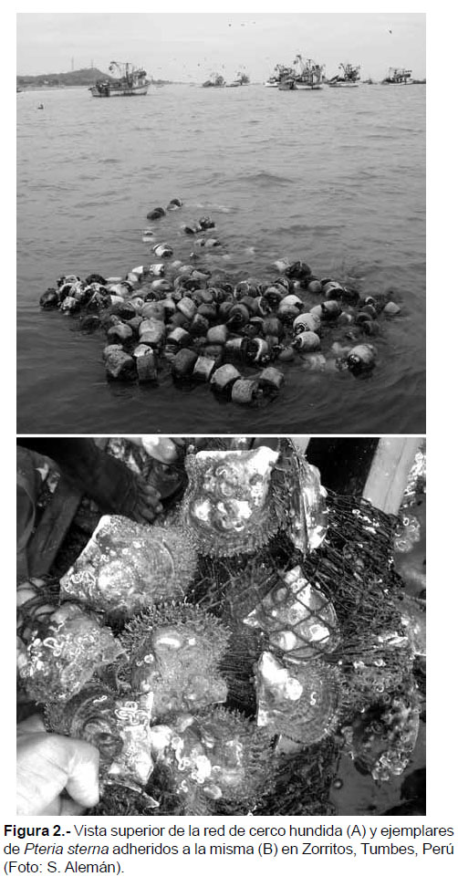 Área de estudio.- El estudio se efectuó al noreste del desembarcadero artesanal de Zorritos (3º4030,7S - 80º4020,8W) (Fig. 1). La población estudiada estaba asentada sobre una red de cerco de 38.1 mm de tamaño de malla, 1481.6 m de largo y 27.8 m de altura, atracada en el fondo a una profundidad de 4 m, proveniente del naufragio de la embarcación LA BENDICION DE CRISTO PT-3439-CM [sic] (de 15 t de capacidad de bodega, 10.9 m de eslora, 4.1 m de manga y 1.81 m de puntal), ocurrido el 28 de enero de 2010.