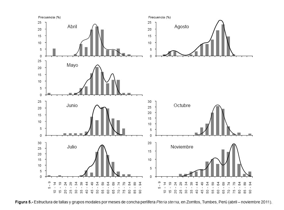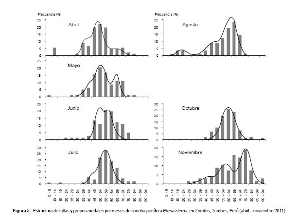 Entre abril y noviembre de 2011, se colectaron 622 ejemplares de concha perlífera (promedio de 89 ejemplares por mes), con rango de talla de 5 a 94 mm AV. La talla media se incrementó de 50.6 mm AV en abril a 65.4 mm AV en noviembre, mostrando una variación de 14.8 mm durante los siete meses evaluados (+29.2%) (Tabla 1). Se observó una tendencia positiva de la media durante abril a junio, para estabilizarse hasta agosto (invierno), e incrementar nuevamente de octubre a noviembre (Fig. 4). La estructura de tallas indicó la presencia de reclutamientos continuos con máximos en abril y agosto (Fig. 5).Grupos modales.- Se diferenciaron como máximo tres grupos modales en abril, mayo, agosto y noviembre (la media ± desviación estándar del menor y mayor grupo modal fue, en abril: 38.9± 3.25 cm AV y 70.7± 6.85 cm AV; mayo: 40.5± 4.64 mm AV y 70.0± 3,21 mm AV; agosto: 19.5± 4.77 y 65.2± 4.67 mm AV; y noviembre: 39.5± 6.01 mm AV y 75.5± 5.13 mm AV). En total se detectaron cinco grupos de edad. El grupo 1 se presentó en agosto (19.5± 4.77 mm AV) y noviembre (39.5± 6.01 mm AV), el grupo 2 de julio (43.6± 3.37 mm AV) a noviembre (56.7± 5.98 mm AV), el grupo 3 de abril (38.9± 3.25 mm AV) a noviembre (75.5± 5.13 mm AV), el grupo 4 de abril (51.5± 5.51 mm AV) a junio (59.8± 7.12 mm AV), y el grupo 5 en abril (70.7± 6.85 mm AV) y mayo (70.0± 3.21 mm AV) (Fig. 5).