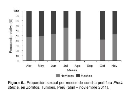 Proporción sexual.- Se analizaron 522 ejemplares de concha perlífera, de los cuales 162 fueron machos, 164 hembras, y 196 indeterminados. La proporción sexual global registrada (una hembra por cada macho) no se diferenció de la proporción esperada (1 H: 1 M; X2= 0.012; gl= 1; p> 0.05), aunque sólo en julio favoreció a los machos (2 M: 1 H; X2= 5.0; gl= 1; p< 0.05) (Fig. 6).