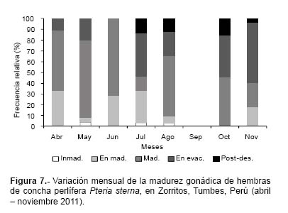 Se registraron desoves durante seis de los siete meses estudiados. Al respecto, Díaz y Bückle-Ramírez (1996) observaron que P. sterna realizó desoves parciales prácticamente todo el año, lo que fue confirmado por Monteforte (2005), quien registró la actividad reproductiva continua de esta especie en Bahía de La Paz, México, observando dos ciclos de desove y reclutamiento en colectores durante verano e invierno, aspecto que se observaría en las especies perleras netamente tropicales como Pinctada albina (Lamarck, 1819), P. margaritifera (Linnaeus, 1758) , P. maxima (Jameson, 1901) y P. fucata (Gould, 1850).