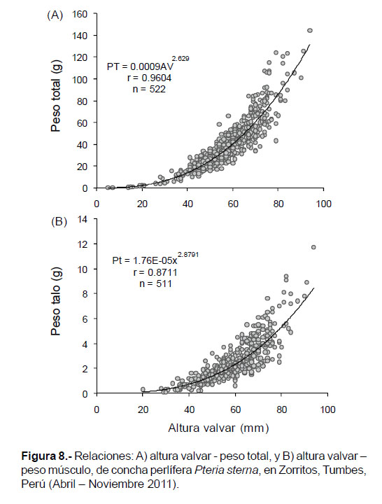 Entre abril y noviembre de 2011 se analizó una población de Pteria sterna (Gould, 1851) que se encontraba adherida a una red de cerco hundida en Zorritos, Tumbes, Perú (3º4030.7S -80º4020.8W). Los individuos presentaron tallas de 5 a 94 mm de altura valvar. La talla promedio se incrementó hacia finales del periodo evaluado. La estructura de tallas mostró la presencia de reclutas en la mayoría de meses evaluados, con máximos en abril y agosto. Se registraron cinco grupos de edad. La proporción sexual fue 1:1. Los desoves fueron continuos, a excepción de junio, con un máximo en noviembre. La relación altura valvar-peso total no mostró diferencias por sexos. El crecimiento de esta especie fue alométrico negativo. Las demás relaciones (potencial: peso del cuerpo-peso total, y lineales: peso del cuerpo-peso total y peso del talo peso total) presentaron elevadas correlaciones. El rendimiento del músculo (talo) representó el 6.3% del peso total.