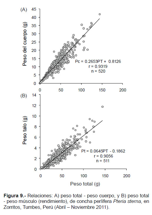 La relación PcPT también mostró alta correlación (r= 0,9319). La ecuación indicó que por cada 100 g de peso total se obtuvieron 27.3 g de peso de cuerpo (Fig. 9A).