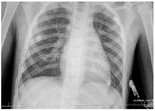 Figura N°1 Radiografía de tórax: imagen muestra leve cardiomegalia y refuerzo parahiliar derecho.