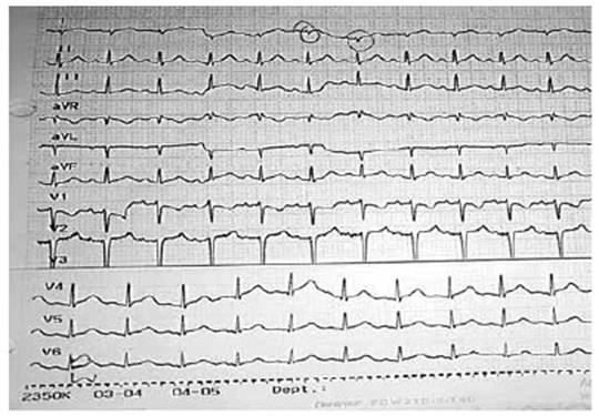 Figura N°2 Electrocardiograma: muestra taquicardia sinusal, complejos QRS de bajo voltaje y leve supra desnivel de ST.