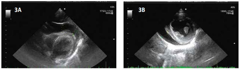 Figura 3 A y B. Imágenes ecocardiográficas que evidencian efusión pericárdica anterior (3A), pozo de 18mm y pericardio hiperecogénico y engrosado. Y efusión pericardica posterior (3B) de iguales características pero de pozo de solo 6mm.