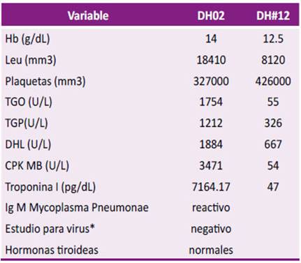 Tabla N° 01. Se describe la evolución de los principales marcadores. * Los virus coxackie, adenovirus, virus sincitial respiratorio, influenza A, B, parainfluenza, metaneumovirus. (DH) día de hospitalización