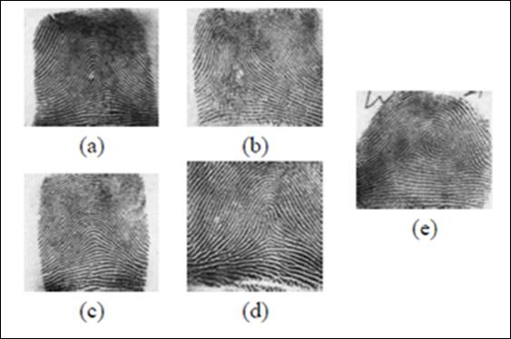 Dass and Jain (2004) based their work on the fingerprint classification of Henry (1900), who proposed five main fingerprint classes based on the NIST4: (a) left loop, (b) right loop, (c) arch, (d) tentarch, and (e) whorl. This classification is shown in Figure 1.