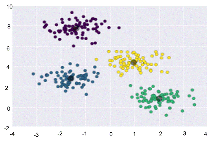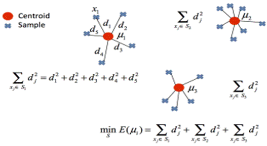 In this project, we specifically employ an algorithm called k-means, which is a data segmentation/clustering algorithm. This method was formally proposed for the first time in 1957 by the mathematician Stuart P. Lloyd, although it was officially published in 1982 in an article entitled Least Squares Quantization in PCM. Several optimizations of this algorithm have been carried out over the decades, leading to recent implementations. K-means consists of segmenting a set of points in a Euclidean space as follows: First, the algorithm assigns k centroids randomly (where k is an arbitrary value chosen by the user). The clusters are then segmented according to the minimum distance of each point from each of these centroids as shown in Figure 4.