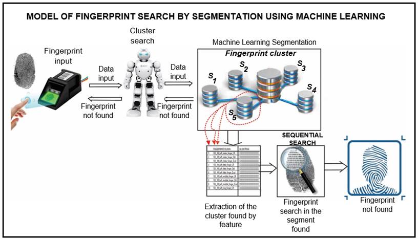 The purpose of this paper is to propose a highly efficient search method using machine learning, which obtains a segmentation of fingerprints from a large database and groups them according to the characteristics of each fingerprint into segments. Then, a linear search algorithm is applied to one of the selected segments, that is, the one containing the fingerprint to be identified. Using this model, search times are minimized with a 95% confidence level. It is also demonstrated in this research that the segmented search is more efficient than performing a linear search in a large database, it is therefore more efficient than the method used by Dass and Jain (2004).