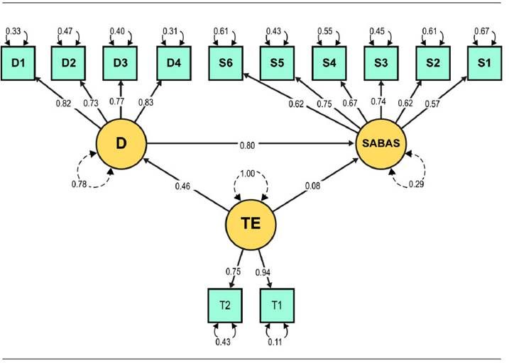 Dada la naturaleza ordinal de las escalas utilizadas, el análisis de confiabilidad se examinó con el omega de McDonalds (ω). Observándose estimaciones de la confiabilidad por consistencia interna que evidencian la presencia de alta confiabilidad (SABAS: α=.84, ω=.82; C-SDS: α=.85, ω=.82; Tecnoestrés: α=.84, ω=.82) dado que son mayores al valor de corte de .70 recomendado para asumir una buena confiabilidad.