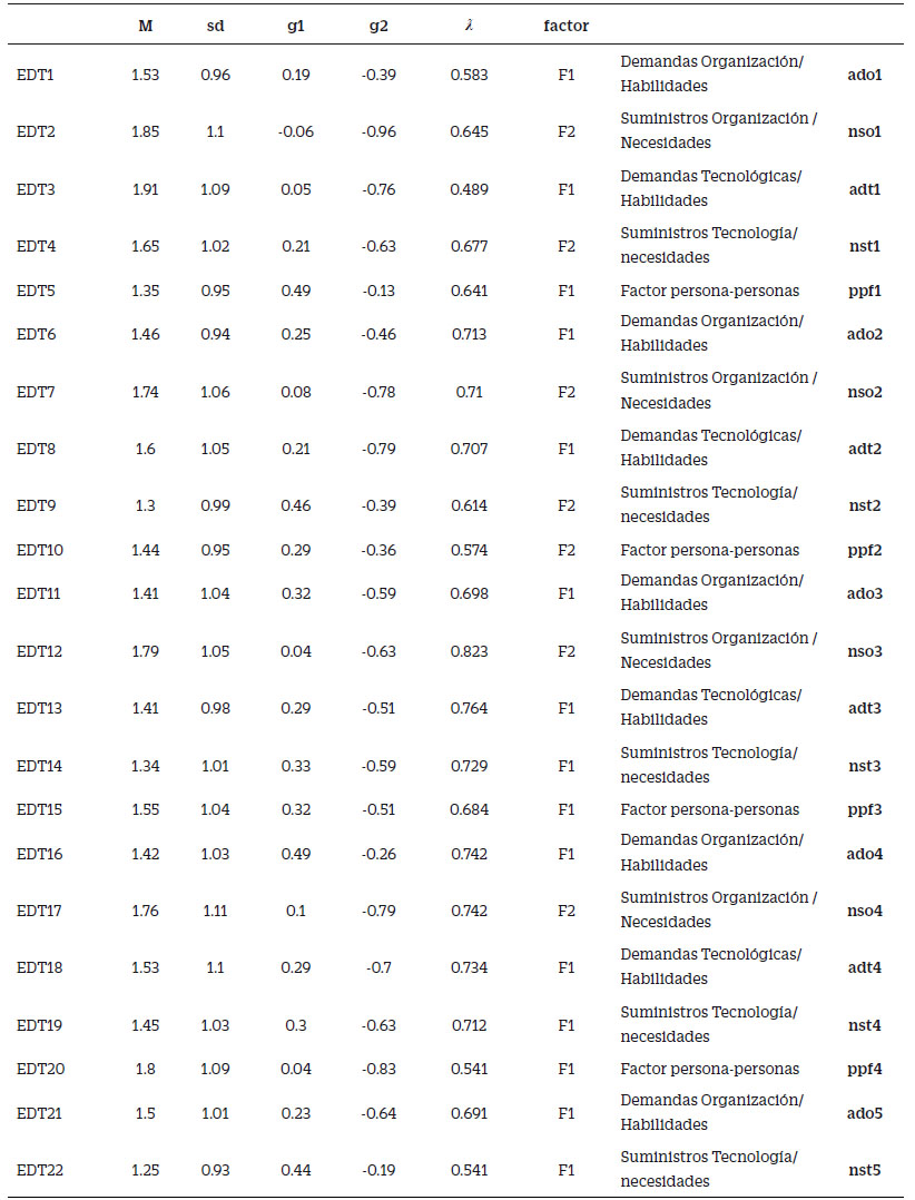 Luego, se planteó un modelo de dos dimensiones con los 22 ítems haciendo uso del estimador MLR. Los hallazgos identifican una estructura bidimensional y bondad de ajuste aceptable (RMSEA = 0.043, SRMR = 0.053, CFI = 0.94, GFI = 0.909). Asimismo, la consistencia del modelo fue favorable en la primera dimensión en la que cae la mayor cantidad de ítems (Demandas) (α =0.92, Ω= 0.92). De igual manera, en su gran mayoría los ítems de Suministros caen en la segunda dimensión la cual también cuenta con favorable consistencia interna (α =0.86, Ω= 0.86). Se señala que la correlación entre las dos dimensiones latentes es moderada, pero aún aceptable para mantener el modelo bidimensional (r = 0.75). (Tabla 2).