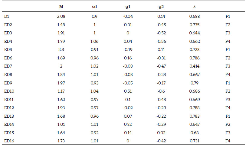 Continuando con la propuesta de los autores de la escala, se propuso un modelo tetradimensional con estimador MLR. El modelo mantiene la misma estructura original con cargas factoriales mayores a 0.60 en su mayoría y un ajuste aceptable(RMSEA = 0.07, SRMR = 0.05, CFI = 0.91, GFI = 0.90). Se mantiene una consistencia aceptable de las cuatro dimensiones (F1, F2, F3, F4) (α=0.83, α=0.81, α=0.70, α=0.81, respectivamente). (Tabla 3).