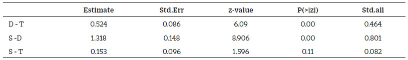 Nota. Y ~ X, es la regresión de la variable X sobre Y; Std.all, coeficientes beta. D, distracción por smartphone; T, tecnoestrés; S, SABAS.