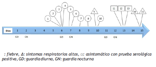 Figura 1 Cronología de detección de infección por SARS-CoV-2 (PCR-RT positivo en hisopado nasofaríngeo) en médicos de un grupo de guardia de un servicio de urgencias.