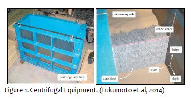 In this equipment, 1:33 scale models have been tested with cubic and wedge blocks. From these studies it has been concluded that the walls made with wedge blocks, have more resistance to seismic loads this is due to the increase in friction forces between the blocks and the filling due to the greater contact surface.