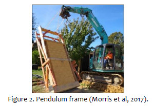 The equipment consists of a pendulum frame with a joint in its base, the specimen is placed inside the frame and an excavator (which serves as an actuator) is used to balance the structure to simulate loads outside its plane equivalent to its own weight. the acceleration induced by heavy machinery. (Figure 2). This equipment has allowed to study the performance of adobe walls.