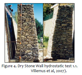 This test requires an arrangement formed by a supporting wall and large bags filled with water that induce hydrostatic lateral loads to the walls tested. This arrangement has made it possible to carry out full-scale tests on stone walls with dry joints with heights of up to 4 meters (Figure 4). The instrumentation used consists of: 10 displacement sensors and monitoring using the stereophotogrammetry technique, which uses photographs and a stereoscope to obtain a false relief proportional to the displacements that have occurred.