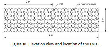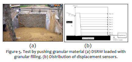 This test requires an arrangement formed by formwork at both ends of the wall and cohesionless fill material that induces hydrostatic lateral loads to the specimens tested. This arrangement has allowed real-scale tests on stone walls with dry joints with heights of up to 2.5 meters. The instrumentation consisted of displacement sensors located in the central part of the wall and distributed throughout its height (Figure 5).