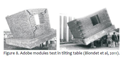 Tilting tables are equipment that allows the base of the specimen to rotate and use its own weight to generate a force on all the particles of the structure in direction perpendicular to the axis of rotation, proportional to its own weight and to the angle of the rotated angle. Tilt table tables are available for testing on a natural scale of up to 4x4 m and for small-scale tests of approximately 2x1 m. The experimental study of walls formed by blocks with dry joints has proved to be adequate to analyze failure modes of masonry structures with dry joints, since this material is composed of stones or bricks interlocked mainly by adhesion and friction (Ceradini, 1992). The first record of experimental tests on a natural scale with tilting tables comes from local research on adobe building systems in 1970 (Figure 8), where ways of reinforcing traditional adobe construction were studied, through vertical and horizontal reinforcement with cane (Zegarra et al, 2000; Blondet et al, 2011).
