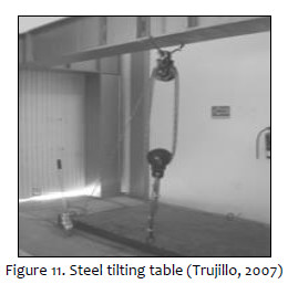 As part of a research campaign conducted at the University of Colima in Mexico, Trujillo (2007) and Rincón (2008) experimented with drywall gypsum blocks on a 2.44 m x 1.22 m steel tilting table. The lifting system consisted of cables and pulleys (Figure 11).