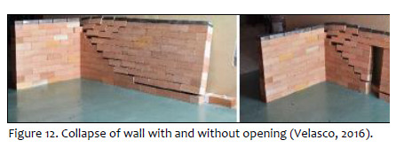 Also from the University of Colima highlights the work of Velazco (2016) who tested on the tilt table walls with and without opening, composed of blocks of wood (Figure 15). The walls have an "L" shape and presented failures due to turning at the base and torsion at the joints.
