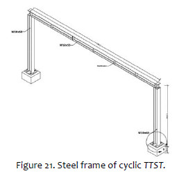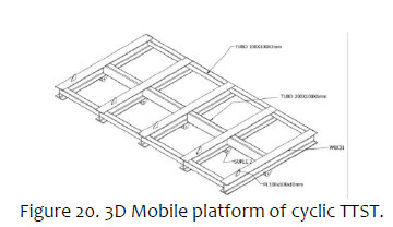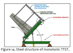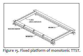 The steel structure of the monotonic TTST tilting table consists of a fixed platform, a mobile platform and a structure to support the filling (Figure 14). The fixed platform consists of W10x33 metal profiles and rectangular tubular sections type HSS-200mmx100mmx6 mm (Figure 15). The mobile platform consists of a cross-section of rectangular tubular sections type HSS-200mmx100mmx6 mm, HSS-100mmx100mmx3 mm, HSS-100mmx50mmx3 / 16 '' and W8x31 beams, in addition a fluted plate will be used to support the DSRW and evenly distribute its weight over the platform. The static and dynamic platforms are joined at a common end by a joint. The structure for support of filling is made up of rectangular tubular sections of HSS-100x50x3 mm, in addition a smooth inner plate of 3 mm will be used to contain the filling (Figure 14). All profiles are made of A-36 steel. The mechanical component will be supported by reinforced concrete pedestals that transmit the loads to the foundation.