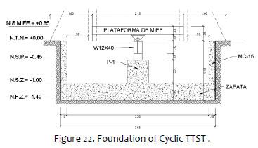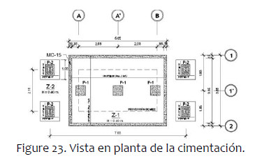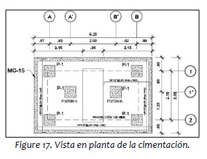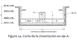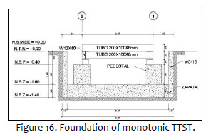 It consists in 3 square pedestals (P-1) of reinforced concrete f'c 280 kgf / cm2 of 50 cm side, which rest on a running shoe of reinforced concrete of f'c 280 kgf / cm2, of rectangular shape with dimensions 3.65 x5.05x0.40 m. Also, containment walls were specified to control the lateral earth pressure (Figure 22).