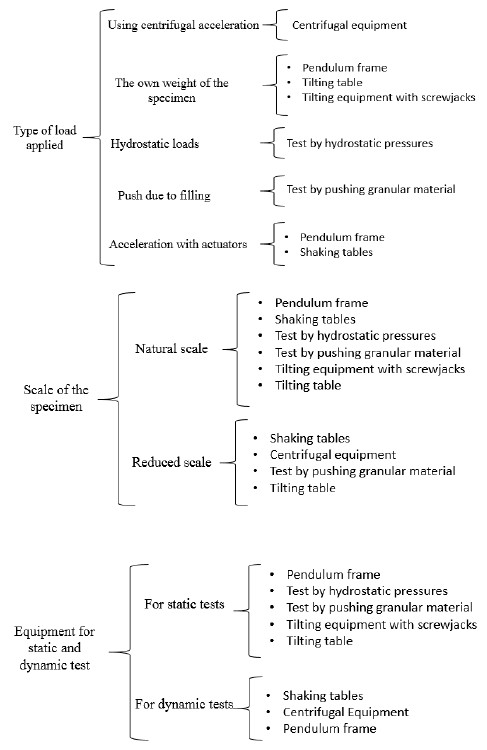 In summary, there are 7 alternatives for experimental tests of walls against lateral loads: centrifugal equipment, pendulum frame, vibrating table, equipment that uses hydrostatic pressures, equipment that uses thrust of granular material, tilt equipment with screwjacks and tilt table. Likewise, these experimental equipments can be classified according to various criteria, such as (Rivas Sánchez, 2019):