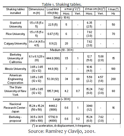 This equipment uses hydraulic, mechanical or electromagnetic actuators to accurately reproduce a seismic movement satisfying the laws of similarity for the scaling of an input signal of displacement, acceleration or frequency, from one or more of its components or recorded accelerogram (Ramírez y Clavijo, 2001). Shaking tables can be characterized by: their dimensions, degrees of freedom, accelerations and maximum displacements, and by their carrying capacity. Table 1 shows some features of the most important shaking tables.