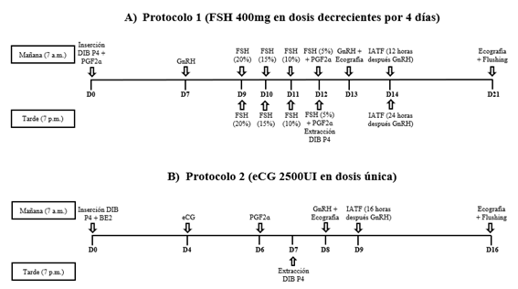En el Prot.1, el D0 las vacas recibieron un dispositivo intravaginal bovino (DIB) con 1g de progesterona (P4) (DIB®, Syntex) y 0,526mg de Cloprostenol sódico (Análogo sintético de PGF2ɑ, Estroplan®, Vetoquinol); el D7 se les administró 0,0105 mg de Acetato de buserelina (Análogo de la GnRH, Conceptal®, MDS Salud animal); a partir del D9 - D12, cada 12 horas se administró 400 mg de FSH (Folltropin®, Bioniche) en dosis decrecientes (20%, 15%, 10% y 5%) (Figura 1A); el D12 también se les administró 0,526mg de Cloprostenol sódico (Análogo sintético de PGF2ɑ, Estroplan®, Vetoquinol) por la mañana, y por la tarde se hizo la extracción del DIB; el D13 se les administró 0,0105 mg de Acetato de buserelina (Análogo de la GnRH, Conceptal®, MDS Salud animal) para inducir la ovulación; el D14 se realizó la IATF con doble dosis de semen criopreservado, el primero a las 12 horas y el segundo a las 24 horas después de la inducción de la ovulación.