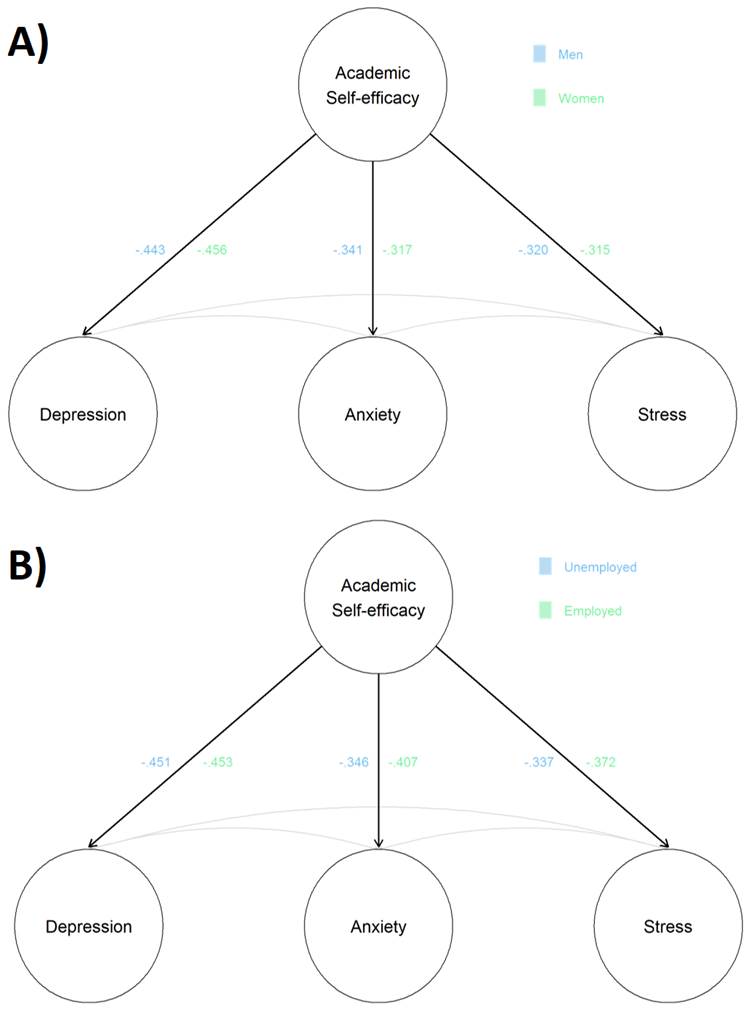 In conclusion, academic self-efficacy can act as a protective factor towards mental health problems related to depression, anxiety, and stress. The observed relationship between academic self-efficacy and all three mental health conditions was statistically significant, moderate, and negative, with a slightly higher effect size for depression. Regarding depression, a higher academic self-efficacy allows university students to be more confident in their own skills, thus allowing them to successfully address academic tasks and avoid negative feelings about their present and future academic endeavors. With reference to anxiety, higher academic self-efficacy prevents worried thoughts and concerns regarding academic chores; as a consequence, academic demands are not seen as potential threats and students are not perturbed by them. Lastly, having a strong confidence in one’s own abilities can act as a coping mechanism towards stressful academic situations. Lastly, multigroup analyses revealed that the measurement and structural model are invariant across sex and work status. Thus, we recommend improving efforts to foster academic self-efficacy on university students in order to reduce the mental health impact that the academic environment and the COVID-19 pandemic brought.