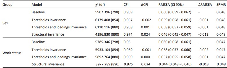 To end with, a multigroup analysis is carried out to assess the invariance of the proposed relationships regarding sex and work status. We follow the modern approach shown by Svetina et al. (2020) which is an applied demonstration of Wu and Estabrook (2016) approach to assess measurement invariance for ordered categorical outcomes in which a baseline model is established, followed by subsequent models where the thresholds and loadings are constrained. Then, we analyzed the structural invariance by constraining the latent variable variances, covariances, and regressions. Incremental indexes ΔCFI, ΔRMSEA, and ΔSRMR were used to determine invariance following common suggestions by Chen (2007), Rutkowski and Svetina (2014;2017), and Svetina and Rutkowski (2017).